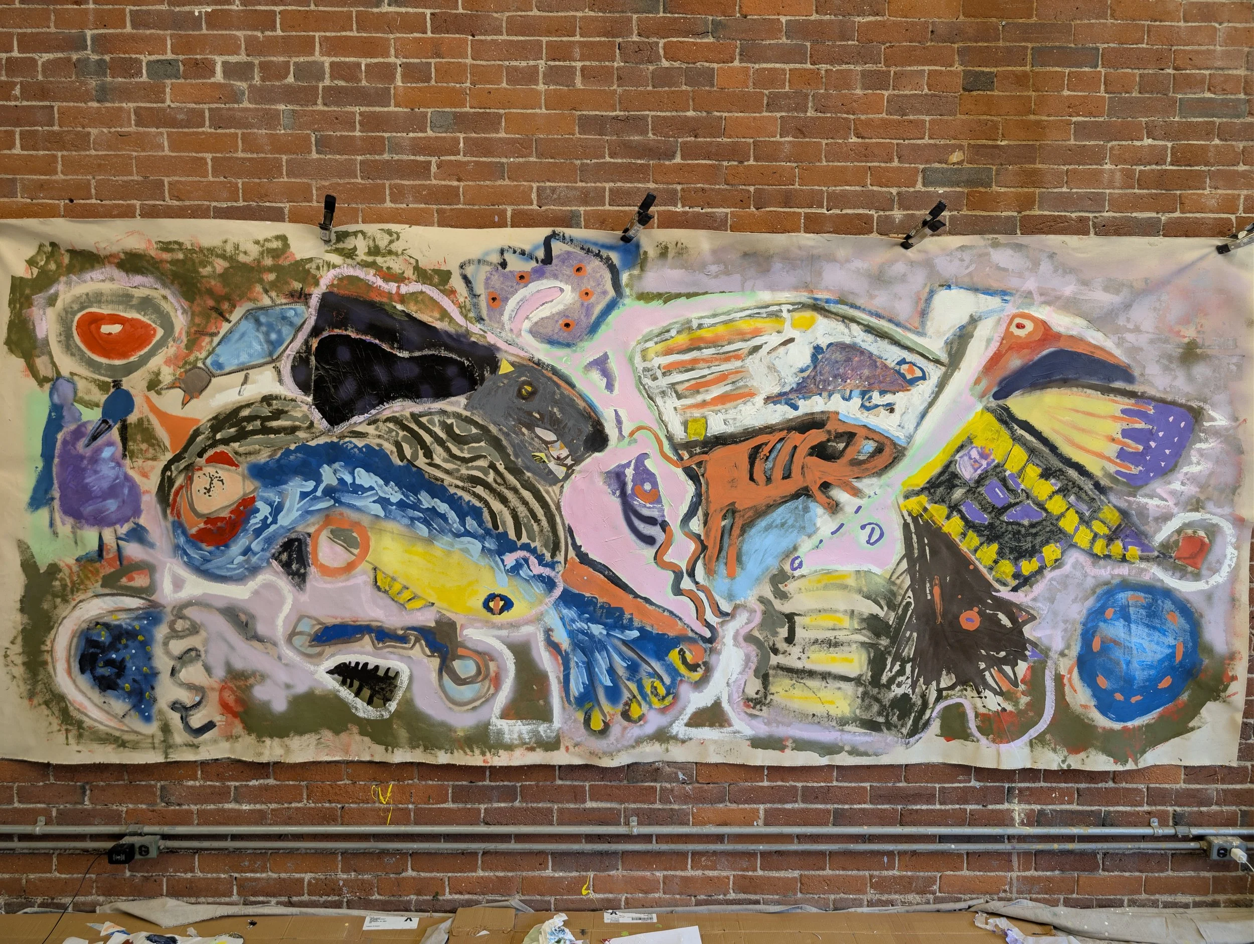 Drew is an artist and father of two living in Portsmouth, NH. He's built his practice through deep study of art history, collaborations with artists locally and internationally, and relentless experimentation in the studio. Every opportunity becomes a way to expand his visual vocabulary, one that exists before words, in the space where feeling and material meet. His work emerges from an intuitive, physical process. Each painting is a negotiation between control and chaos, memory and invention. His continuous practice connects him with the raw immediacy of seeing and making, where imagination doesn't need permission or explanation.